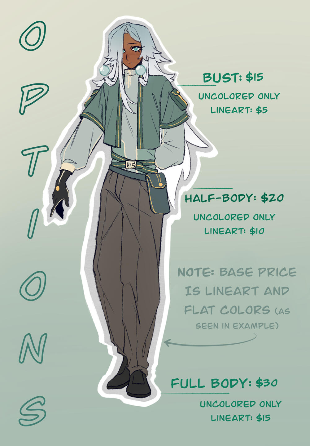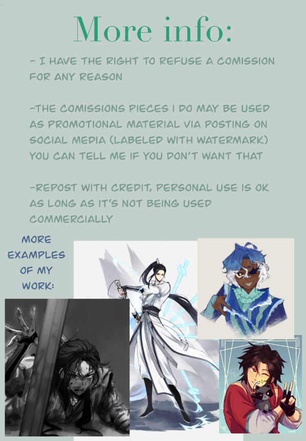 Commissioners will pay me 50% of the piece upfront. I will send the sketch and revisions will be done at the halfway point before I continue to the final render.