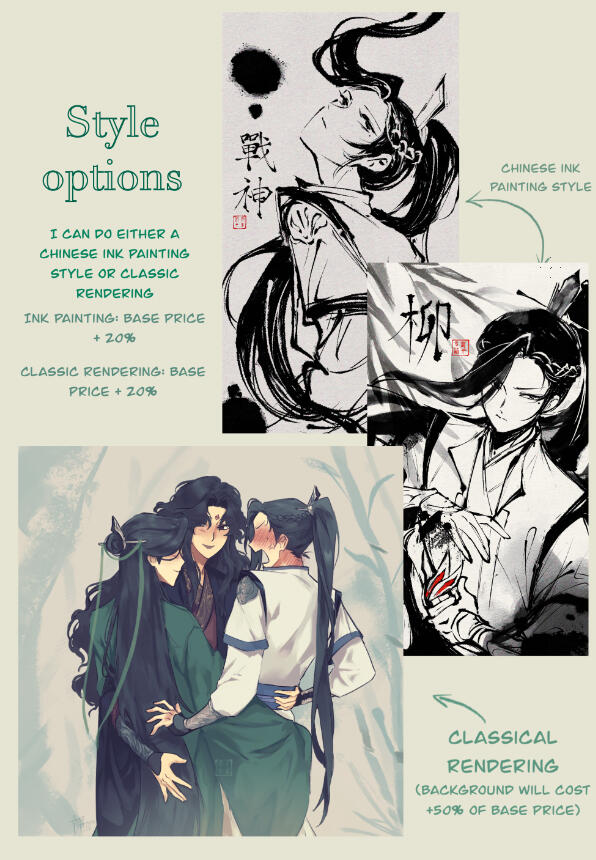When telling me what you want please also tell me how long you are willing to wait for the comms. I usually take a around month to finish.